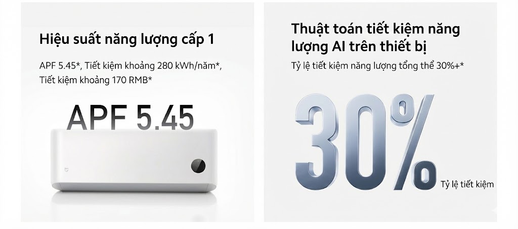 Hiệu suất là điểm Xiaomi tập trung nhất trong lần nâng cấp này. Thuật toán mới giúp giảm mức tiêu thụ điện tối đa 30% so với thế hệ trước. Máy đạt chuẩn hiệu suất năng lượng cấp 1 tại Trung Quốc với chỉ số APF 5.45. Đây là mức thường thấy ở các model cao cấp của những hãng gia dụng truyền thống. Thiết bị cấp 1 được xem là đạt chuẩn hiệu quả năng lượng cao nhất trong hệ thống phân hạng, cho thấy máy tiêu thụ rất ít điện để vận hành.