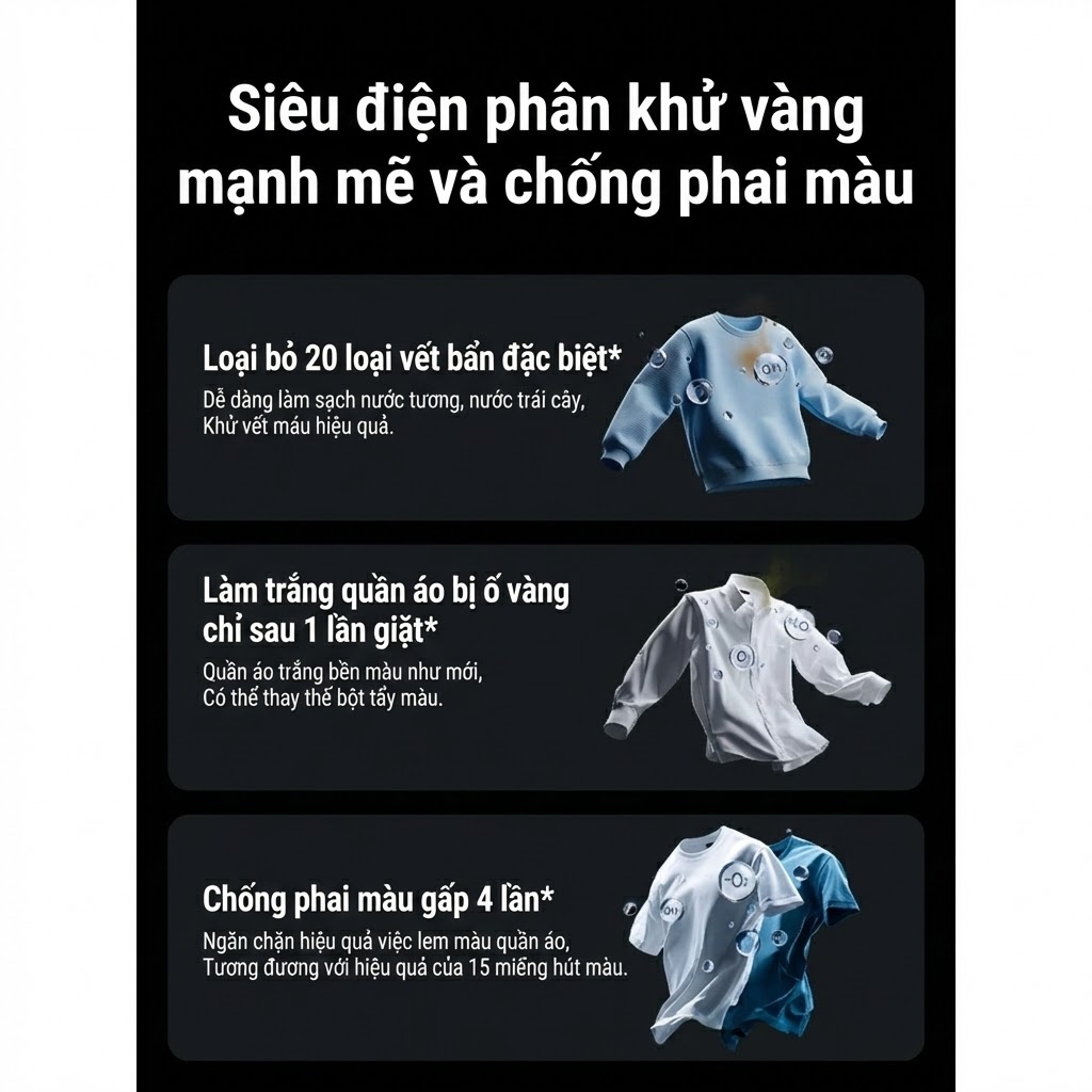 Điểm nhấn chính là công nghệ Super Electrolysis do Xiaomi phát triển. Hệ thống này tạo ra oxy hoạt tính thông qua quá trình điện phân, hỗ trợ tẩy vết bẩn, làm trắng vải và hạn chế lem màu mà không cần phụ gia hóa học. Theo công bố, công nghệ này xử lý được hơn 20 loại vết bẩn cứng đầu như dầu mỡ, máu, nước tương hay nước trái cây. Xiaomi cho biết khả năng bảo vệ màu sắc tăng gấp 4 lần và không để lại cặn trên quần áo.