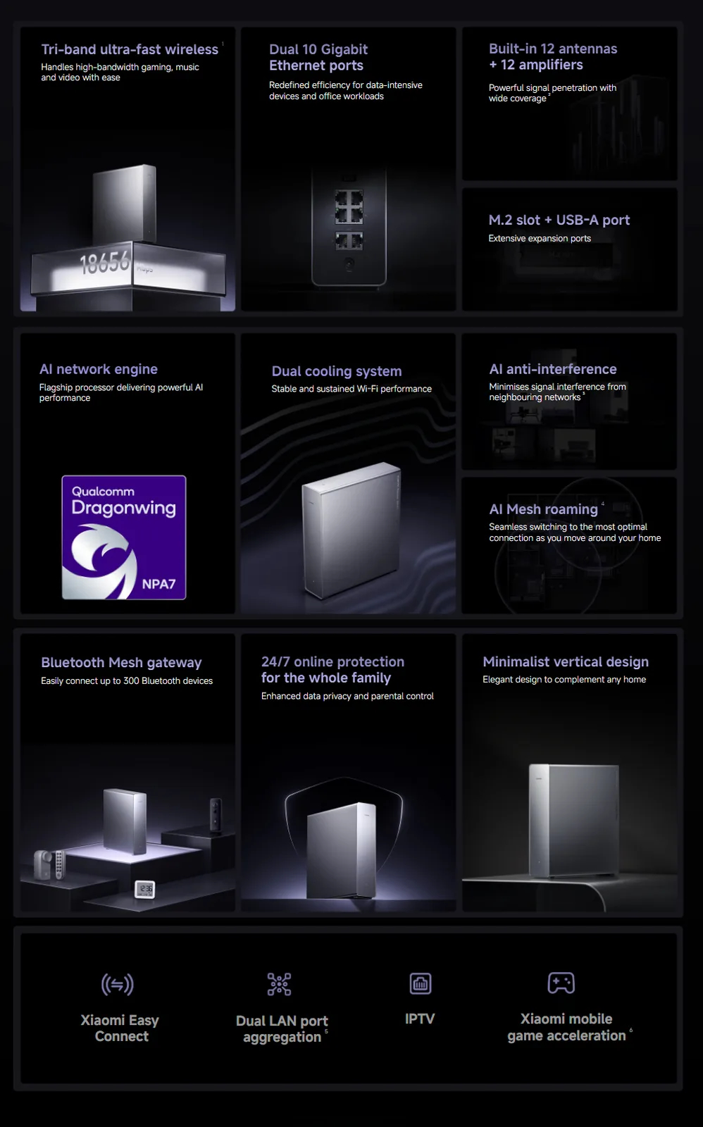 Về thông số, Xiaomi Router BE19000 Pro hỗ trợ chuẩn Wi-Fi 7 với tổng tốc độ truyền tải lên tới 18.656Mbps. Router được trang bị hai cổng 10 Gigabit Ethernet, đáp ứng nhu cầu kết nối có dây tốc độ cao.